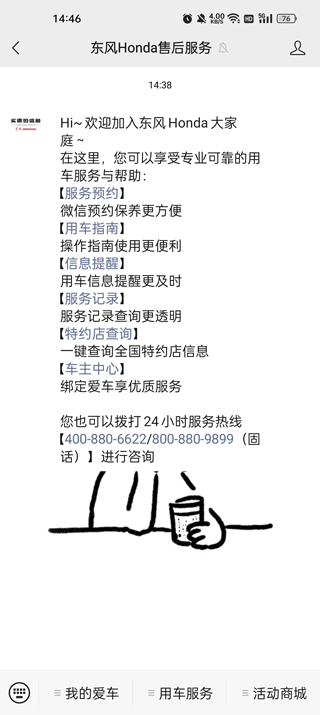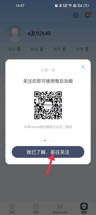 3、点击允许并进入微信扫码关注东风honda售后服务公共号,然后返回绑定微信点击允许进入;