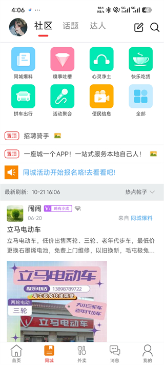 设有同城爆料、糗事吐槽等多个话题板块,可浏览本地帖子、参与活动,是本地居民交流互动的社区平台。