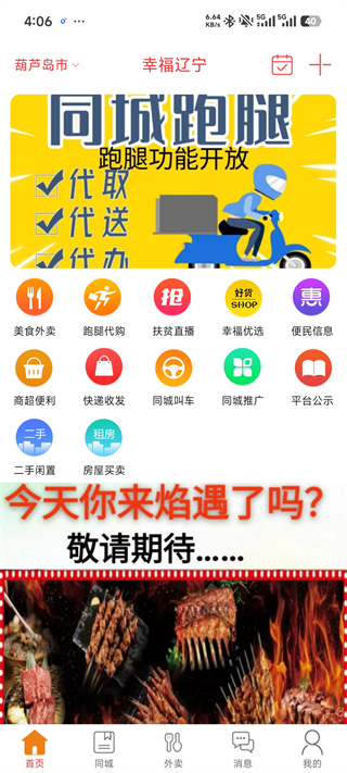 集合美食外卖、跑腿代购、扶贫直播等多样功能入口,还有同城跑腿服务及特色活动预告,为用户提供本地生活一站式服务。