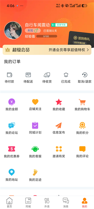 包含订单管理、店铺关注、积分、优惠券等个人功能模块,可进行信息发布、查看足迹,是用户管理个人账号及服务的中心。