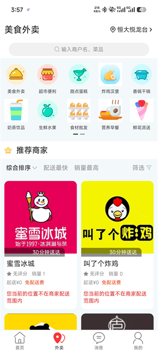 涵盖美食外卖、超市便利等多种品类,聚合蜜雪冰城、叫了个炸鸡等商家,提供便捷的美食外卖服务。