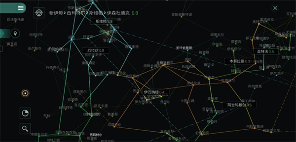 如果点击这个数字或地区名,便可以快速打开星图。而在星图中,我们既可以通过点击左下角的放大镜来搜索地区,还能点击饼状图的图标来切换星图的显示类型,查看星系的主权信息或者是PVP的危险地域。