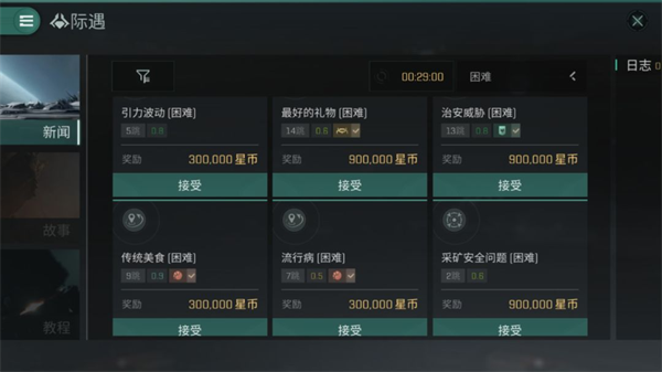 EVE际遇玩法简单点来讲其实就是一个任务大厅,我们可以从里面选取自己所想要接取的任务,只要在指定的时间完成任务我们就可以得到相应的奖励报酬,这些任务无外乎可以分为两大类,一类是非战斗类,包括运输、调查和采矿。另一个则是战斗类,与普通的异常空间相类似(故事书任务除外)。