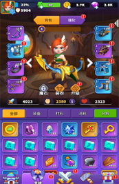 游戏内英雄装备有八个槽位,分别对应武器/帽子/衣服/手套/戒指/披风/项链/鞋子。单个装备有等级和品质区分,战斗胜利获得的强化石能够用于装备属性的强化,在商城内开黄金宝箱能够抽出品质不一的装备。
