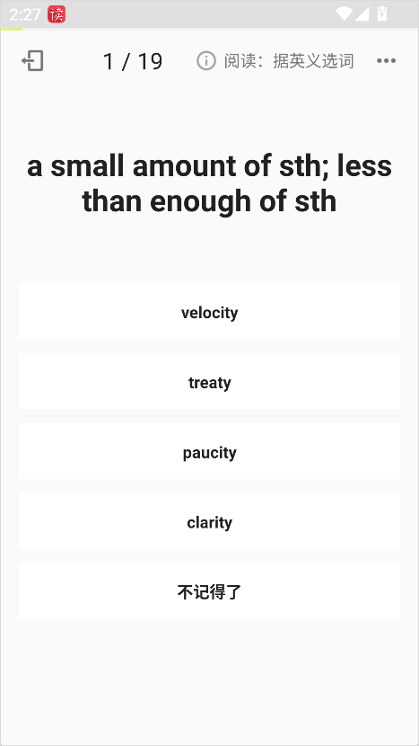 根据单词选择英文释义或近义词(组)。考查对于题干词汇原意的理解,以及对选项中单词/词组的掌握情况。