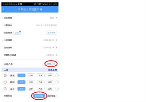 6、出差人员:点击“选择人员”,选择所在部门的出差人,可添加多名同行人员。