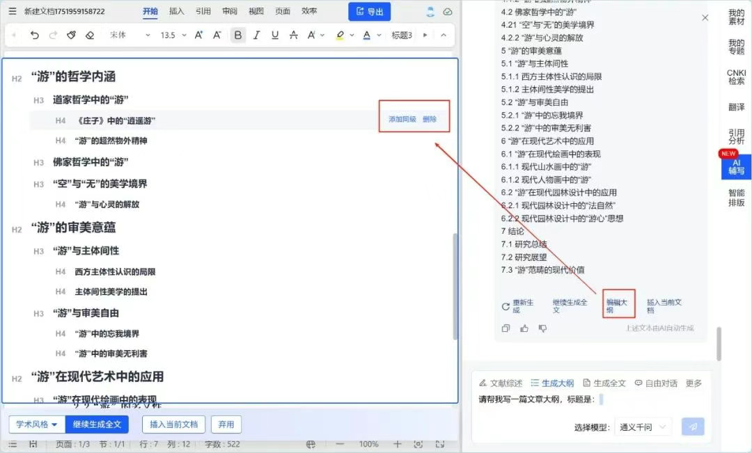 点击【编辑大纲】,进入大纲编辑模式,根据自己的写作想法,对论文大纲进行编辑各级标题、添加同级和子级、删除章节等的修改,使论文逻辑更加顺畅,符合自身需要。