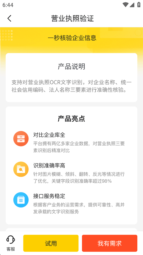 3、在营业执照验证页面点击试用,上传您的营业执照进行验证。
