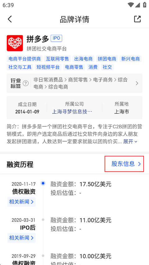 3、在品牌详情页点击股东信息;