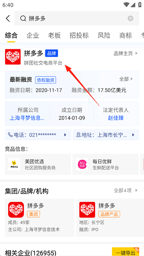 2、在搜索栏搜索您需要查询的企业公司,以拼多多为例;