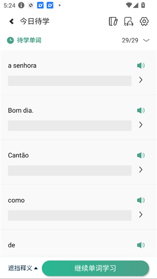 多模式记忆:单词卡片(简/详模式)、AI发音评测、葡语默写、听学循环播放 、弹幕背单词