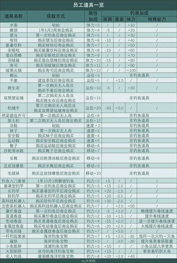 员工道具可以通过商会购买等途径获得,在增加员工能力的同时部分员工道具可以在钓鱼的时候装备以改变钓鱼的三项属性