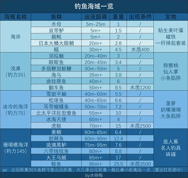 无论你甩出钓钩的力量多低,钓鱼时至少都能甩出5m的距离(例如甩钩力量为20时去珊瑚礁海域,还是能甩到45m的位置)
