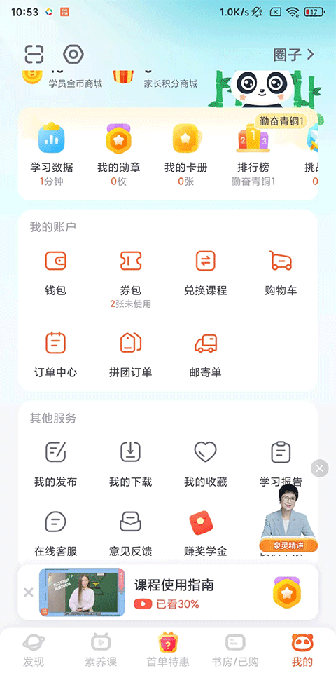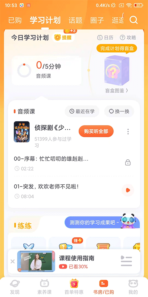 5、购买的课程可以在书房/已购页中查看,也可以在此页制定学习计划,参加话题讨论,逛圈子等;