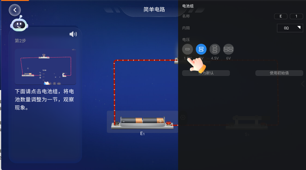 选中任意器材后,可在属性面板中修改实验参数,如电压、电流或距离等。