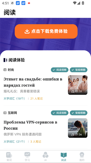 莱特俄语学习背单词App是专为俄语学习者打造的一款科学记忆学习工具软件,融合艾宾浩斯遗忘曲线智能复习,动态攻克变格变位核心难点。提供多维度训练:AI发音评测、单词卡片、俄剧听力素材及游戏化闯关。莱特俄语背单词App更有真人级AI口语陪练,覆盖日常对话、商务谈判等场景,搭配ТРКИ考试(A1-C2)词库和真题强化,助你高效突破俄语难关!解锁VIP还可无限AI对话、离线学习等特权,学习更自由。