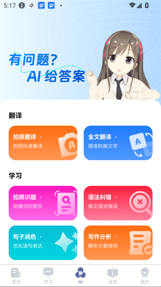 AI解答疑问,内置翻译、学习、练习等功能(如拍照翻译、拍照识图、语法纠错)
