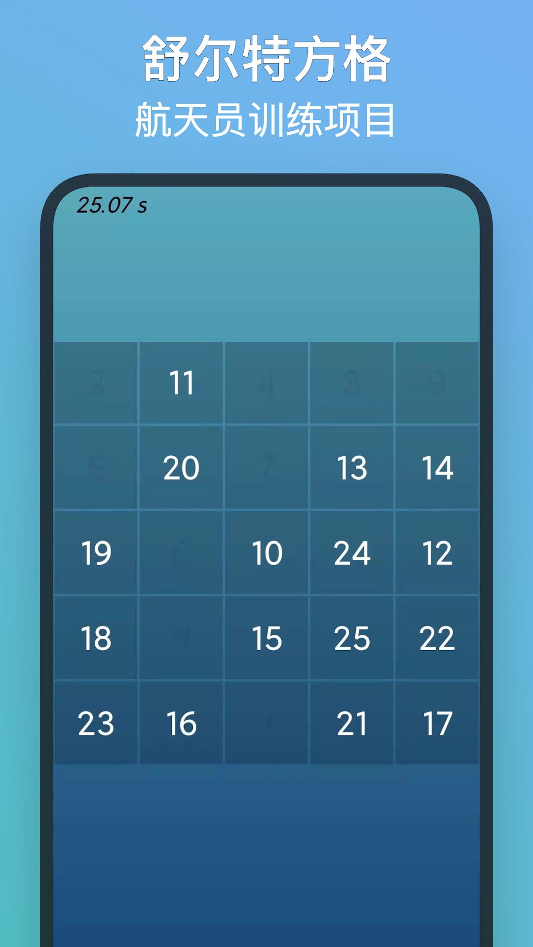 舒尔特方格法普遍运用于飞行员、航天员的注意力训练。以25格为例,据称,我国飞行员平均用时在6.25秒以内,杨利伟用时3.04秒,是我国用时最短的飞行员。
