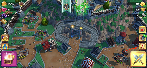 6、除了进攻玩法,游戏中还需要做好城防建设,将视角移至城堡外的区域,即可查看可布置的防御设施,如炮塔等。