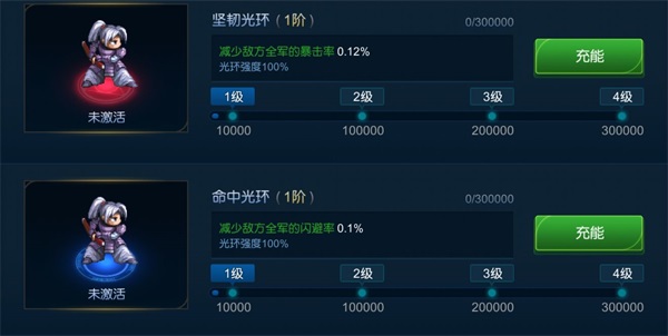 光环的充能能量来自于送礼,无论是送出还是接受礼物都可以获得能量,然后将能量充到你需要的光环里,充到一定程度就可以激活对应等级对应你选的光环,光环的唯一作用是抵消对方的装备效果,分为三种,抵消对方的暴击率加成,抵消对方的闪避率加成,抵消对方的对英雄额外追加伤害,另外,光环有耐久,在你携带光环的情况下,如果你输掉了对局,那么光环的耐久就会掉1%,耐久可以靠金币修复,光环削弱对方的具体效果就是光环本来的效果乘以耐久度,耐久度上限是100%,但没有下限,也就是耐久可以为负数,这时候它就会变成辅助对方的光环,反而增加对方的效果,所以有了光环之后,使用期间注意及时维修。