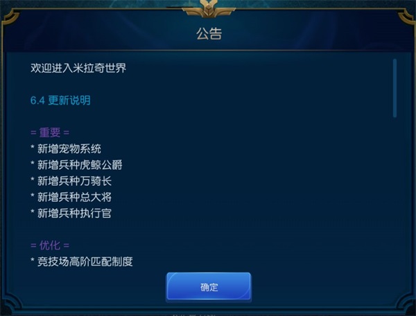 每次米拉奇的更新都会带来很多变化,让游戏变得更好玩的同时,也会改变整个的套路体系,让游戏越来越复杂,你需要学会发掘每次更新带来的具体改变,参照更新说明获得有用的信息,然后根据1-5条,调整自己的打法以适应版本,一定要记住,米拉奇战记的体系是牵一发而动全身的,前五条之间并不是互相独立的而是互相渗透交叉的,它们不能独立存在,攻略只是为了方便叙述所以才进行分类,任何版本改动带来的改变都不局限于影响某一条,而是会带来复杂的综合影响,另外在这里提一句,米拉奇有一些兑换码可以对于萌新开局提供很好的帮助,例如ilovemw和TapTap2000以及兵种大熊的获得方法(加姓名为米拉奇熊起的人的好友即可获得,但其实没太大作用),另外推荐微氪党玩家开局氪金一个每日礼包和一张月卡,总价31基本就够了,剩下的就是时间积累和技术磨炼了。