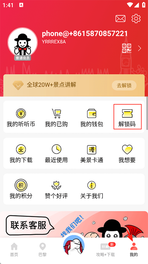 1、复制邮件内的解锁码或订单详情的券号,打开“美景听听”,点击“我的”再点击“解锁码”;