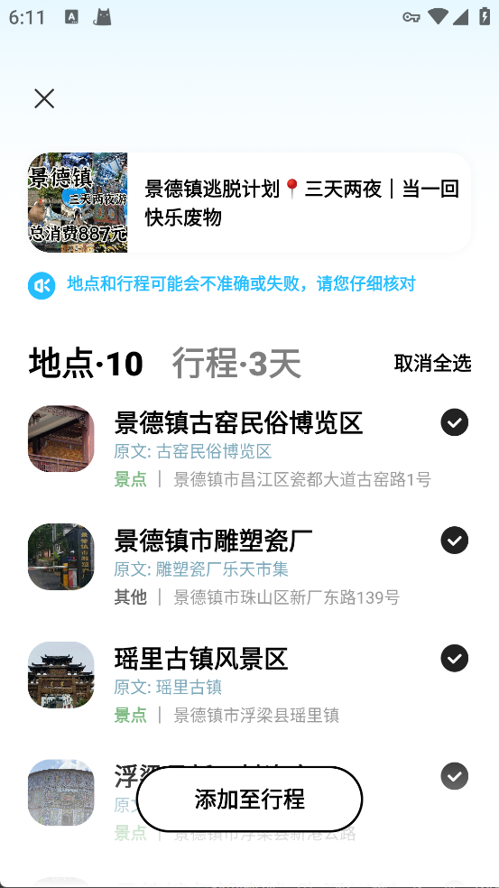 4、识别完成后,核对并勾选需要的地点/行程,点击“添加至行程”即可完成导入