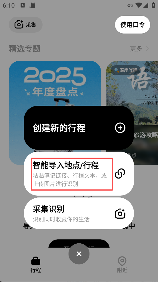 2、在弹出的选项中选择“智能导入地点/行程”